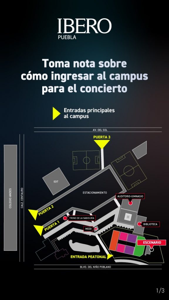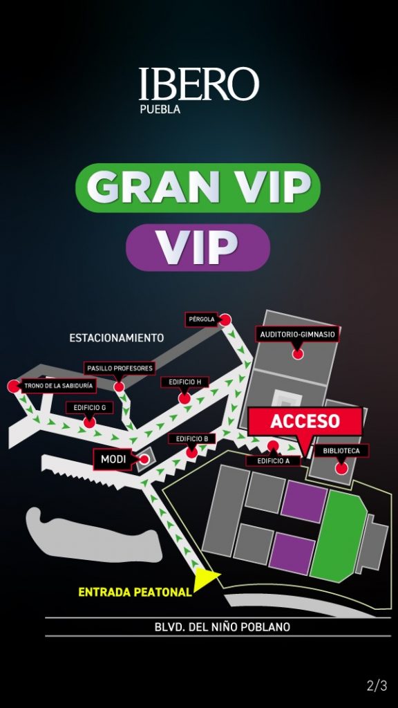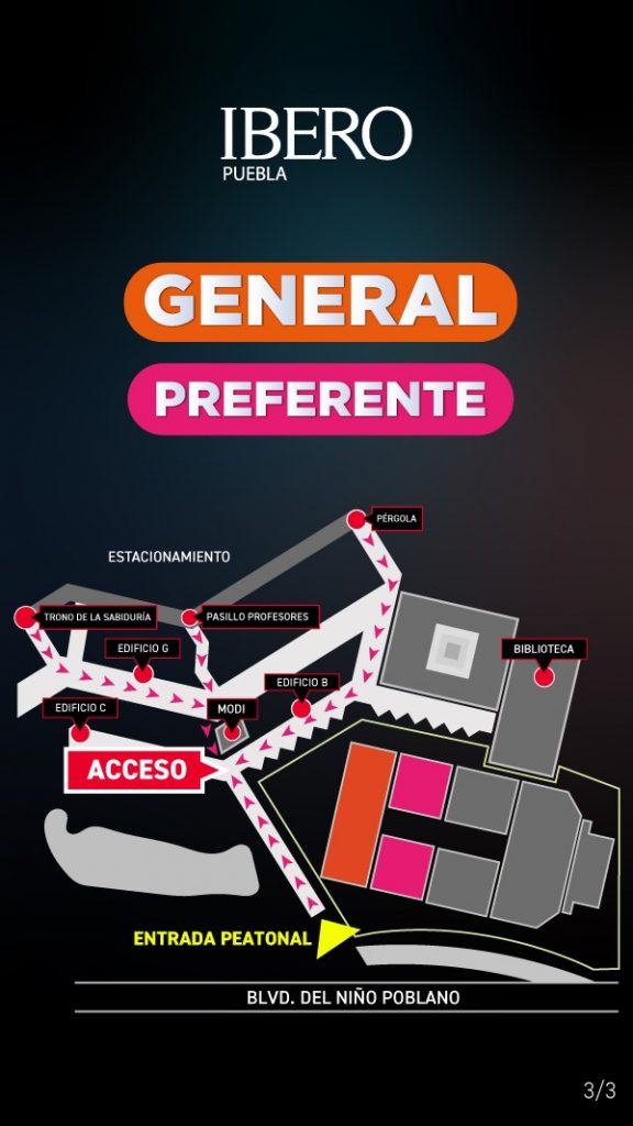 El acceso peatonal estará habilitado por bulevar del Niño Poblano y avenida del Sol (Puerta 3), mientras que las Puertas 1 y 2, ubicadas en avenida Centauro, y la Puerta 3 permitirán ingreso vehicular. Las zonas GRAN VIP y VIP tendrán acceso entre el edificio A y la Biblioteca Interactiva Pedro Arrupe, SJ; Preferente y General ingresarán por el lobby de los edificios B y C.